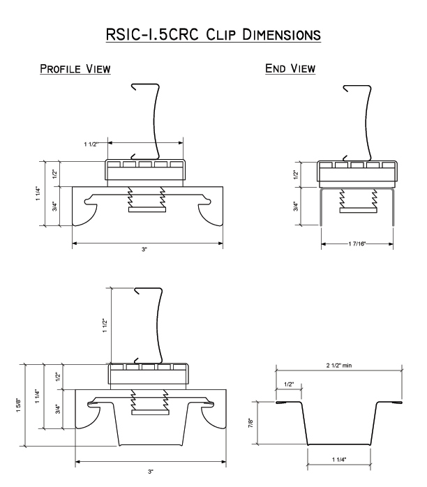 The RSIC-1.5CRC™ is designed for use with any joist or concrete application where a dropped drywall ceiling is required. This assembly decouples the Gypsum Board from the floor structure above, giving the assembly enhanced acoustical performance, while allowing for a chase to hide mechanical ducting and plumbing lines. The RSIC-1.5CRC™ Clip snaps onto cold rolled channel, allowing for all of the wires supporting the cold rolled channel to be hard connected to the ceiling above, including the vertical strut. The RSIC-1.5CRC™ decouples the Gypsum Board below the cold rolled channel to ensure a complete decoupling of the Gypsum Board for optimum noise control.